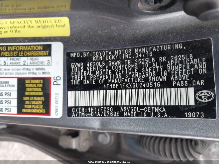 2016 TOYOTA CAMRY 2016 року Бензин, 2.5, Передній привід, vin - 4T1BF1FKXGU240516 з США