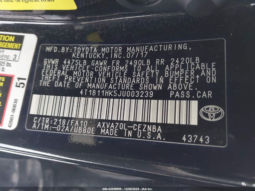 2018 TOYOTA CAMRY 2018 року Бензин, 2.5, Передній привід, vin - 4T1B11HK5JU003239 з США