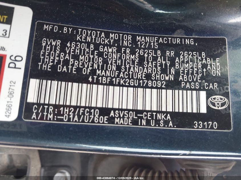 2016 TOYOTA CAMRY 2016 року Бензин, 2.5, Передній привід, vin - 4T1BF1FK2GU178092 з США
