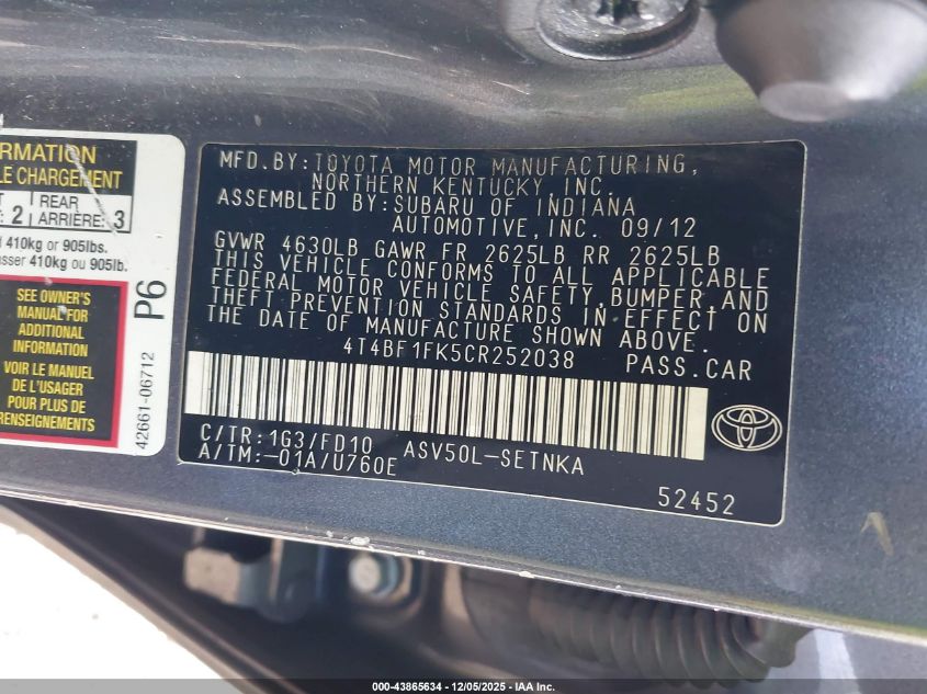 2012 TOYOTA CAMRY 2012 року Бензин, 2.5, Передній привід, vin - 4T4BF1FK5CR252038 з США