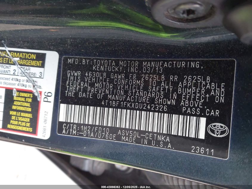 2013 TOYOTA CAMRY 2013 року Бензин, 2.5, Передній привід, vin - 4T1BF1FKXDU242326 з США