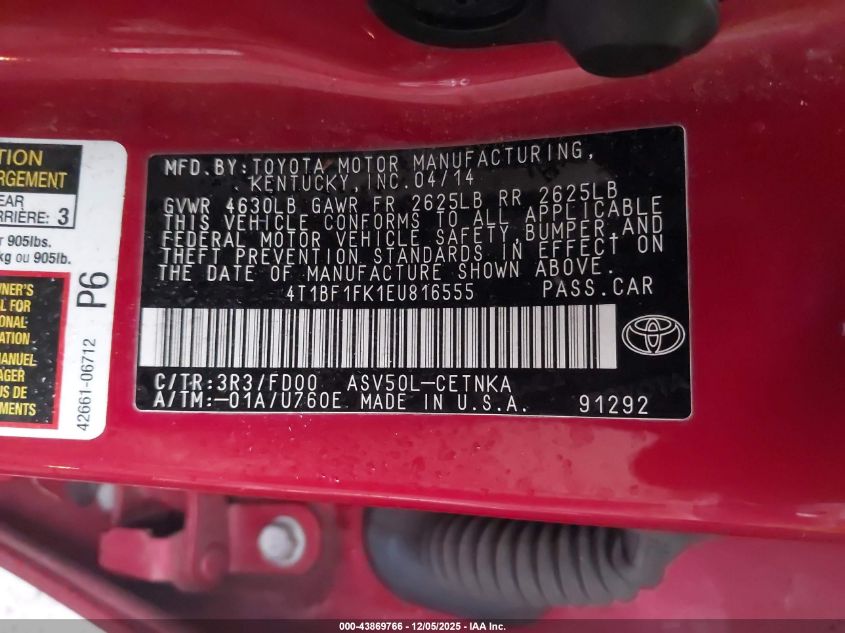 2014 TOYOTA CAMRY 2014 року Бензин, 2.5, Передній привід, vin - 4T1BF1FK1EU816555 з США