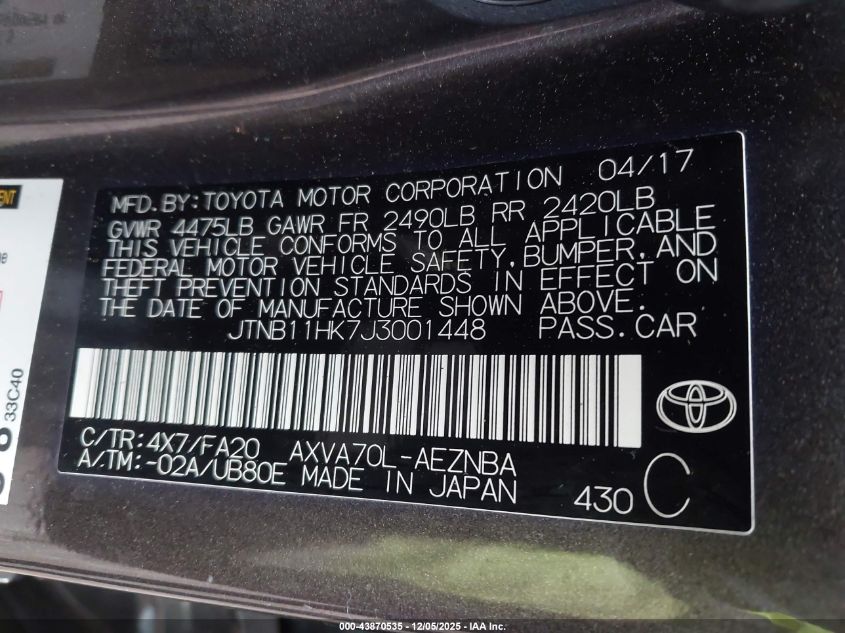 Колір ЧорнийЦиліндри 4Привід Передній привідVIN JTNB11HK7J3001448Стан Заводиться та їде (перевірено)Ушкодження Передня або задня AutoRIA