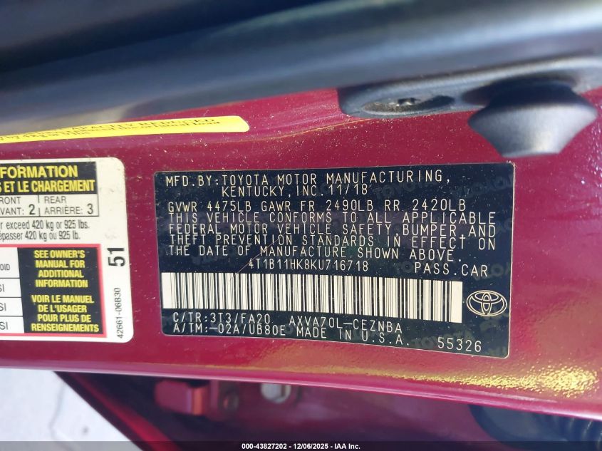 2019 TOYOTA CAMRY 2019 року Бензин, 2.5, Передній привід, vin - 4T1B11HK8KU716718 з США