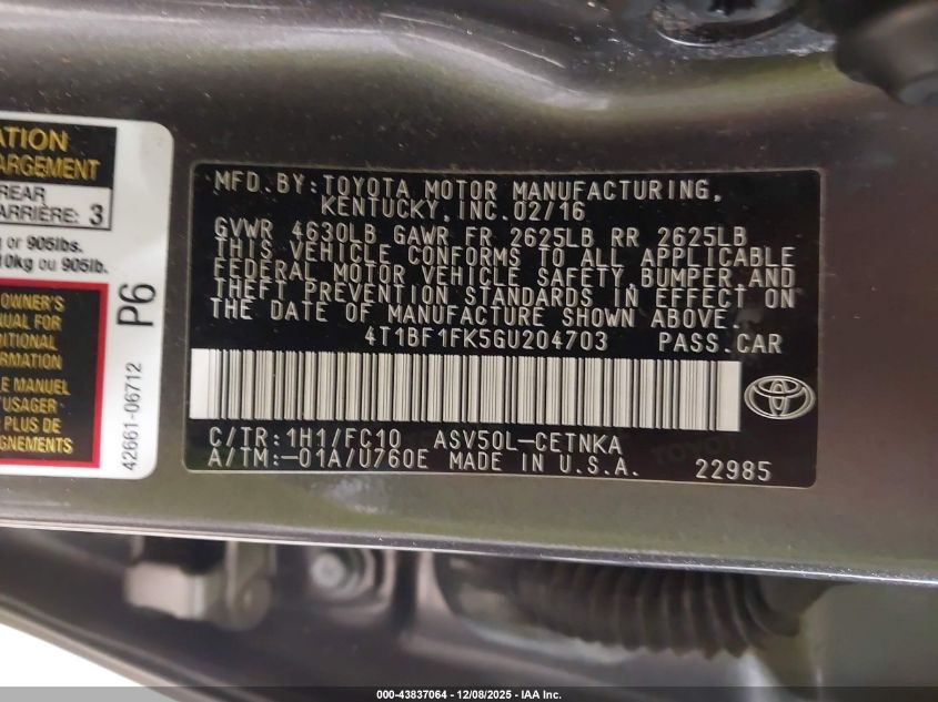 2016 TOYOTA CAMRY 2016 року Бензин, 2.5, Передній привід, vin - 4T1BF1FK5GU204703 з США