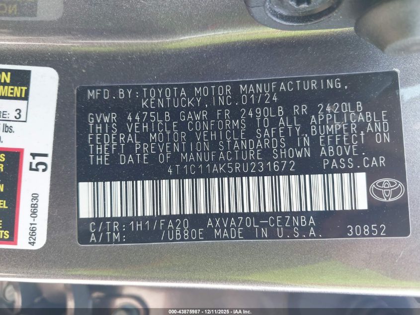 2024 TOYOTA CAMRY 2024 року Бензин, 2.5, Передній привід, vin - 4T1C11AK5RU231672 з США