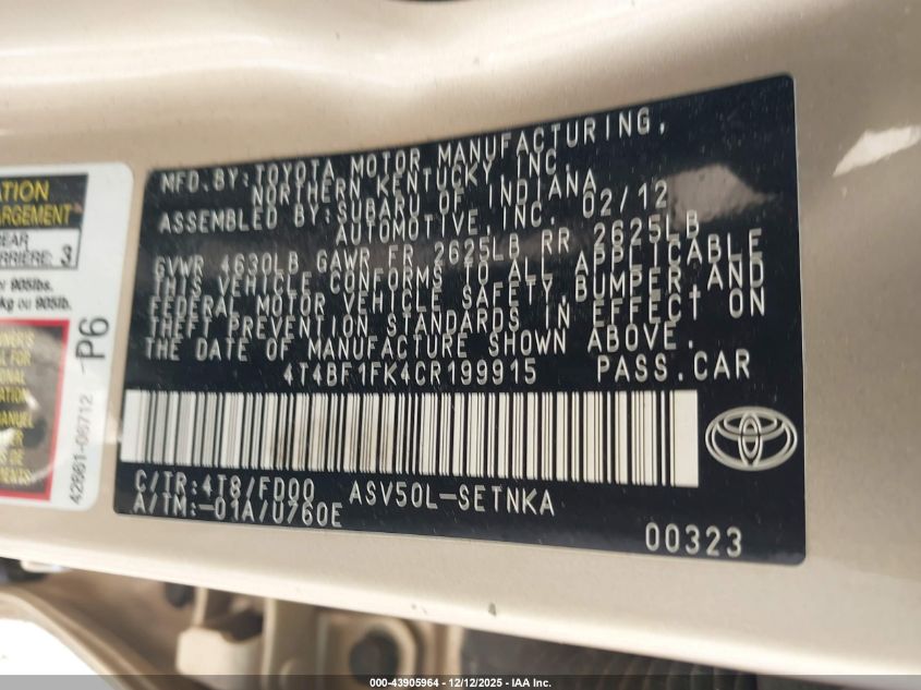Колір ЗолотийЦиліндри 4Привід Передній привідVIN 4T4BF1FK4CR199915Стан Заводиться та їде (перевірено)Ушкодження Передня і задня AutoRIA