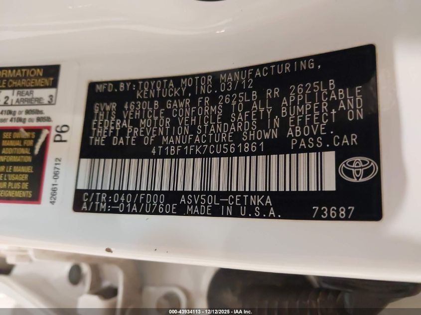 2012 TOYOTA CAMRY 2012 року Бензин, 2.5, Передній привід, vin - 4T1BF1FK7CU561861 з США