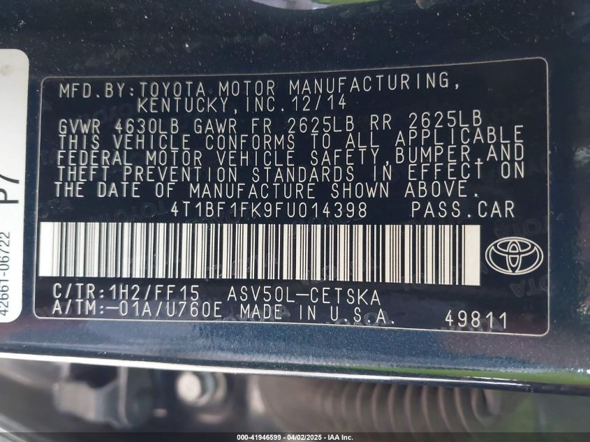 2015 TOYOTA CAMRY 2015 року Бензин, 2.5, Передній привід, vin - 4T1BF1FK9FU014398 з США