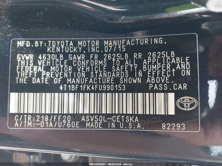 2015 TOYOTA CAMRY 2015 року Бензин, 2.5, Передній привід, vin - 4T1BF1FK4FU990153 з США