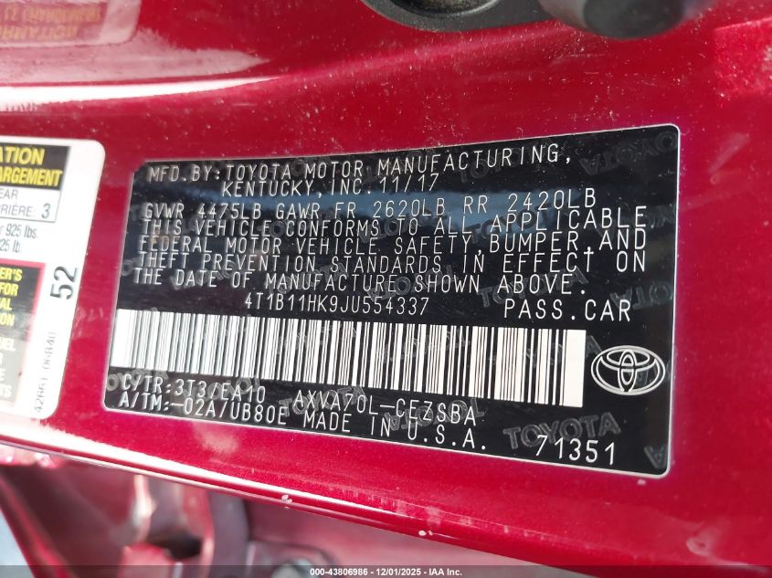 2018 TOYOTA CAMRY 2018 року Бензин, 2.5, Передній привід, vin - 4T1B11HK9JU554337 з США