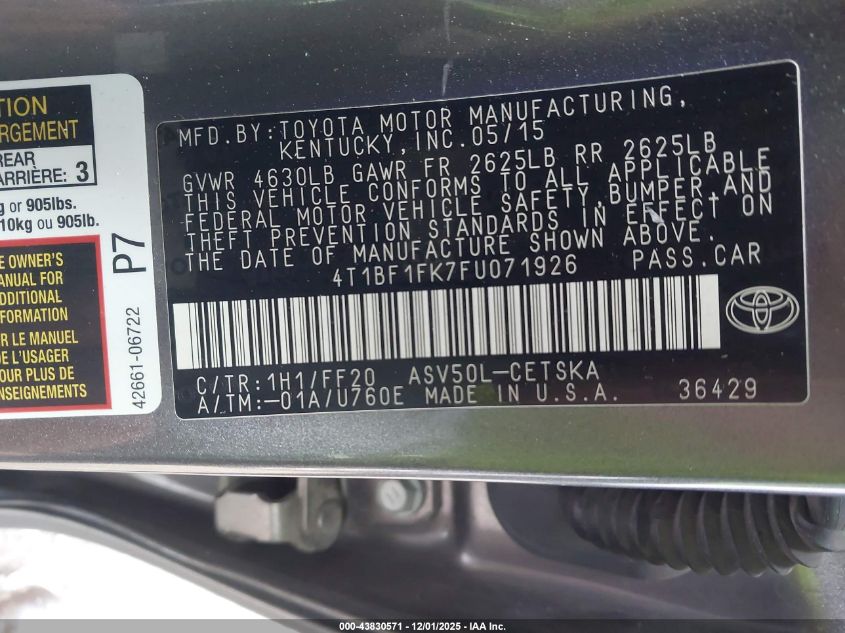 2015 TOYOTA CAMRY 2015 року Бензин, 2.5, Передній привід, vin - 4T1BF1FK7FU071926 з США