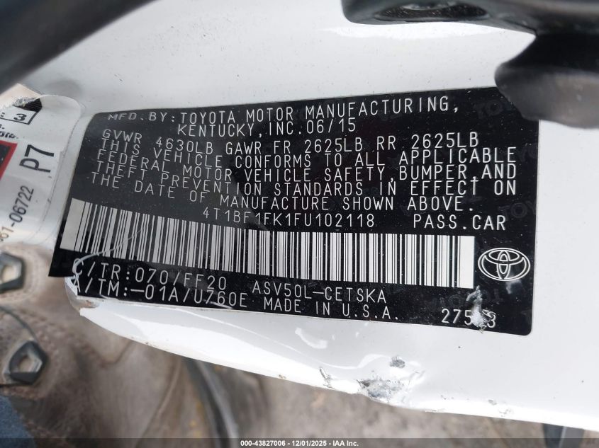 2015 TOYOTA CAMRY 2015 року Бензин, 2.5, Передній привід, vin - 4T1BF1FK1FU102118 з США