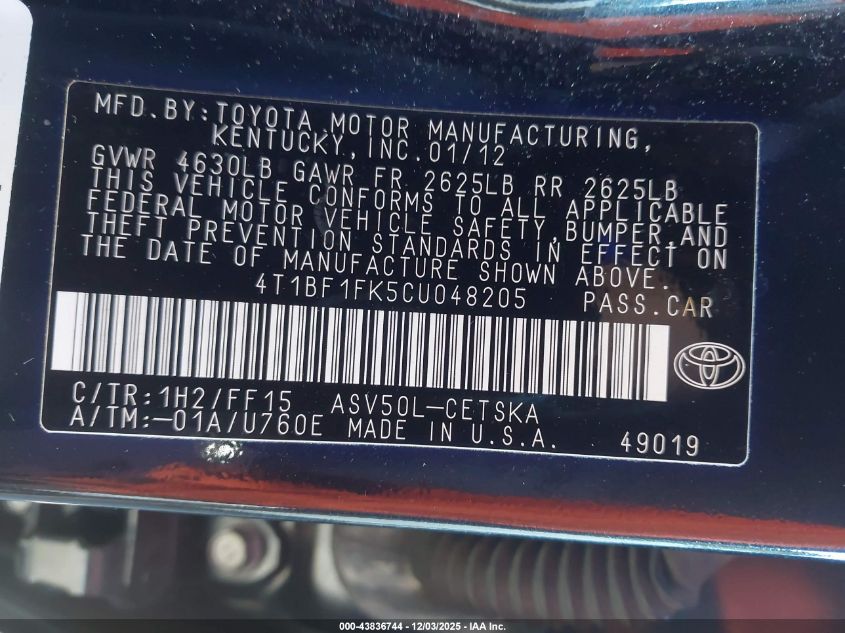 2012 TOYOTA CAMRY 2012 року Бензин, 2.5, Передній привід, vin - 4T1BF1FK5CU048205 з США