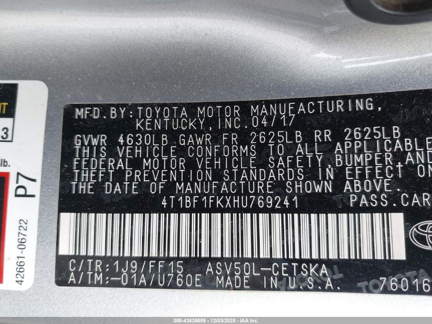 2017 TOYOTA CAMRY 2017 року Бензин, 2.5, Передній привід, vin - 4T1BF1FKXHU769241 з США