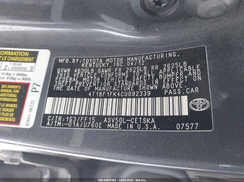 2012 TOYOTA CAMRY 2012 року Бензин, 2.5, Передній привід, vin - 4T1BF1FK4CU092339 з США