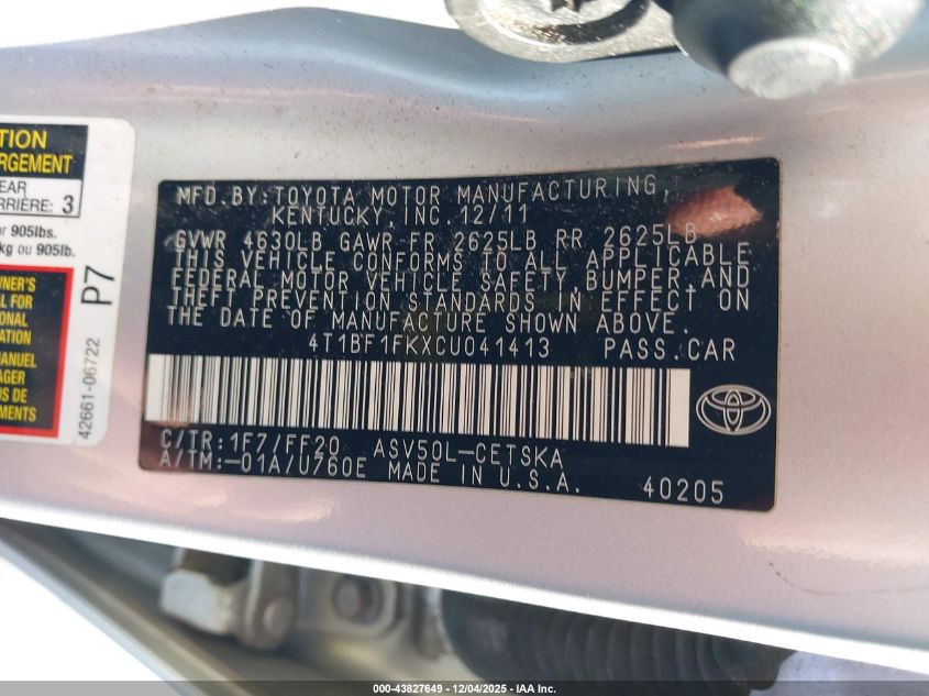 Колір СрібнийЦиліндри 4Привід Передній привідVIN 4T1BF1FKXCU041413Стан СтаціонарноУшкодження Механічні пошкодженняДата аукціону 2025-12-10 AutoRIA