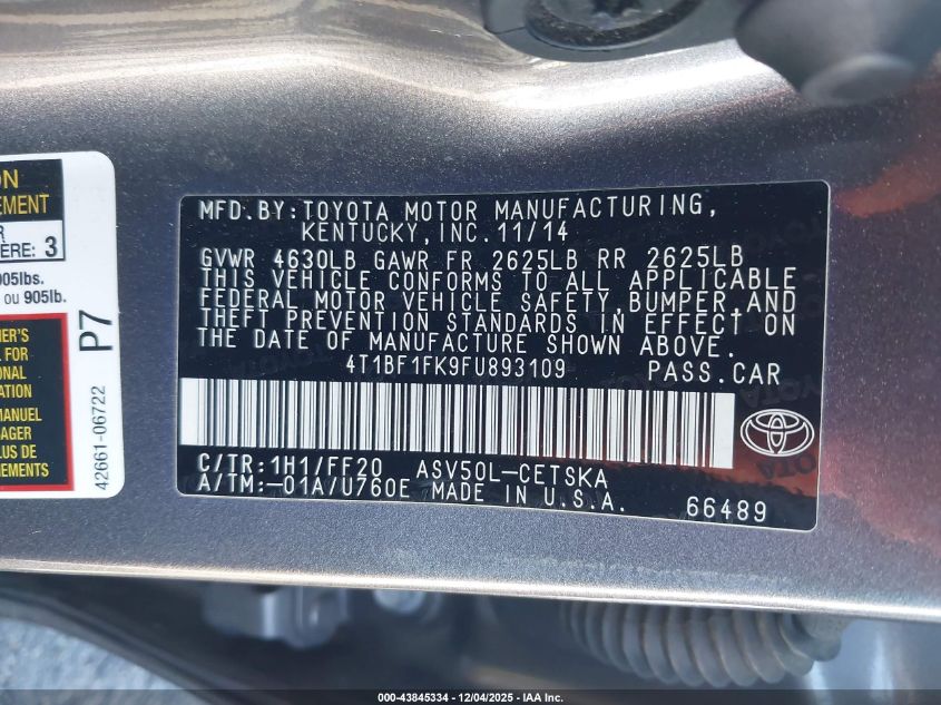 2015 TOYOTA CAMRY 2015 року Бензин, 2.5, Передній привід, vin - 4T1BF1FK9FU893109 з США