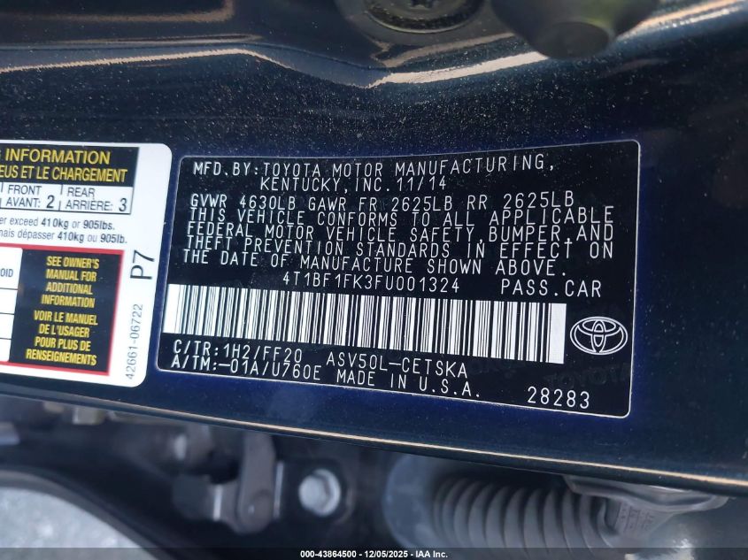 2015 TOYOTA CAMRY 2015 року Бензин, 2.5, Передній привід, vin - 4T1BF1FK3FU001324 з США