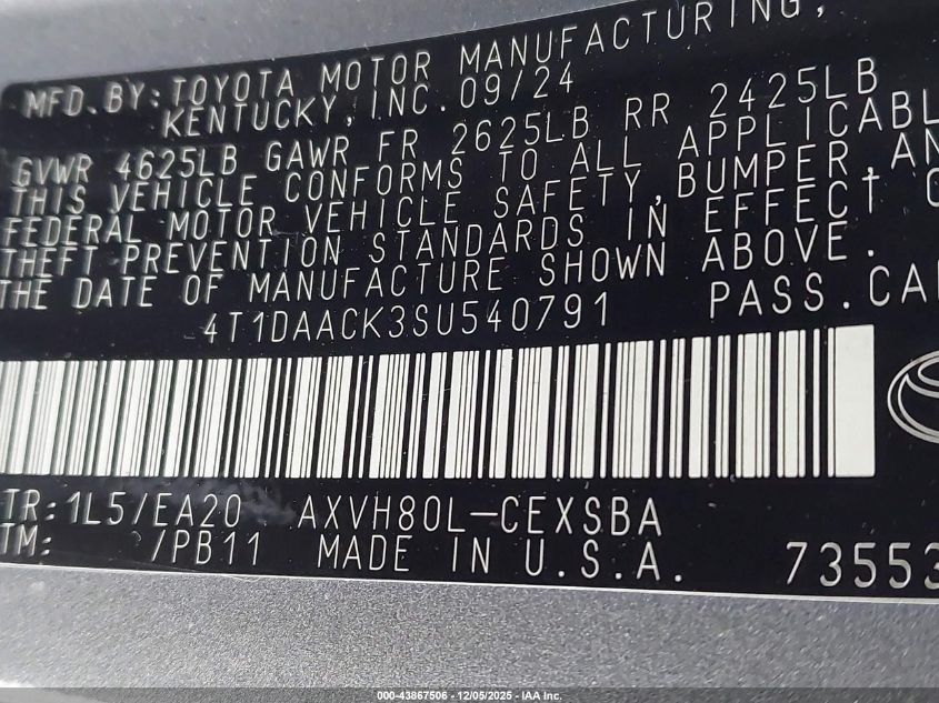 2025 TOYOTA CAMRY 2025 року Гібрид, 2.5, Передній привід, vin - 4T1DAACK3SU540791 з США