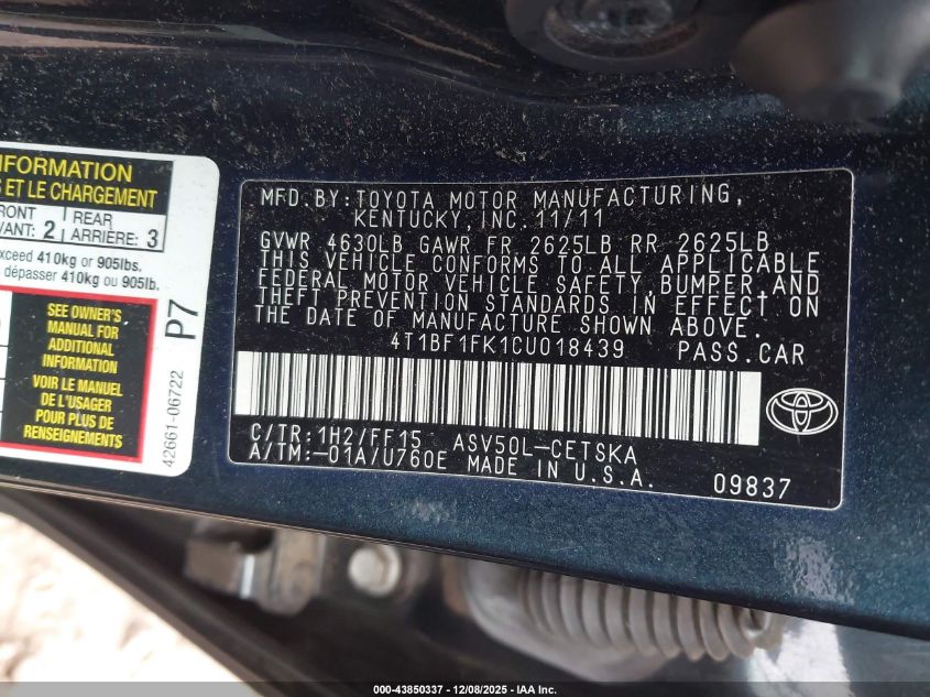 2012 TOYOTA CAMRY 2012 року Бензин, 2.5, Передній привід, vin - 4T1BF1FK1CU018439 з США