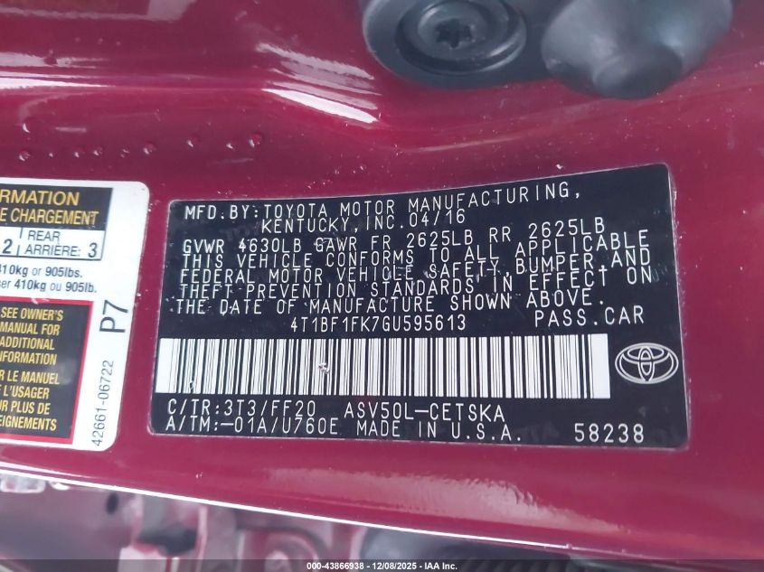 2016 TOYOTA CAMRY 2016 року Бензин, 2.5, Передній привід, vin - 4T1BF1FK7GU595613 з США