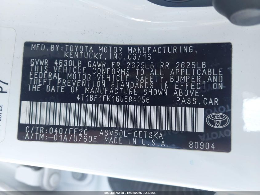 2016 TOYOTA CAMRY 2016 року Бензин, 2.5, Передній привід, vin - 4T1BF1FK1GU584056 з США