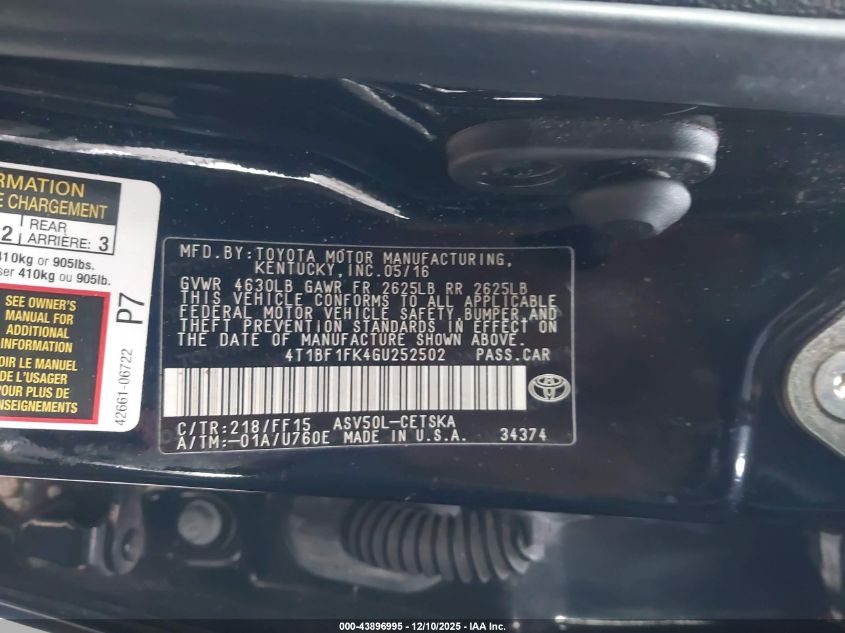 2016 TOYOTA CAMRY 2016 року Бензин, 2.5, Передній привід, vin - 4T1BF1FK4GU252502 з США
