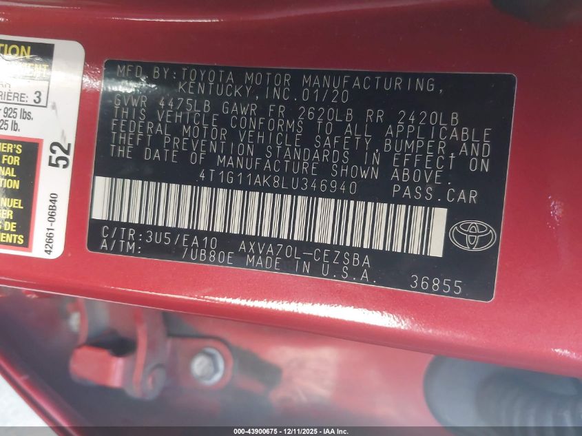 2020 TOYOTA CAMRY 2020 року Бензин, 2.5, Передній привід, vin - 4T1G11AK8LU346940 з США