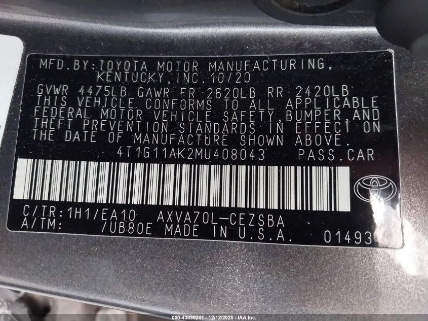 2021 TOYOTA CAMRY 2021 року Бензин, 2.5, Передній привід, vin - 4T1G11AK2MU408043 з США