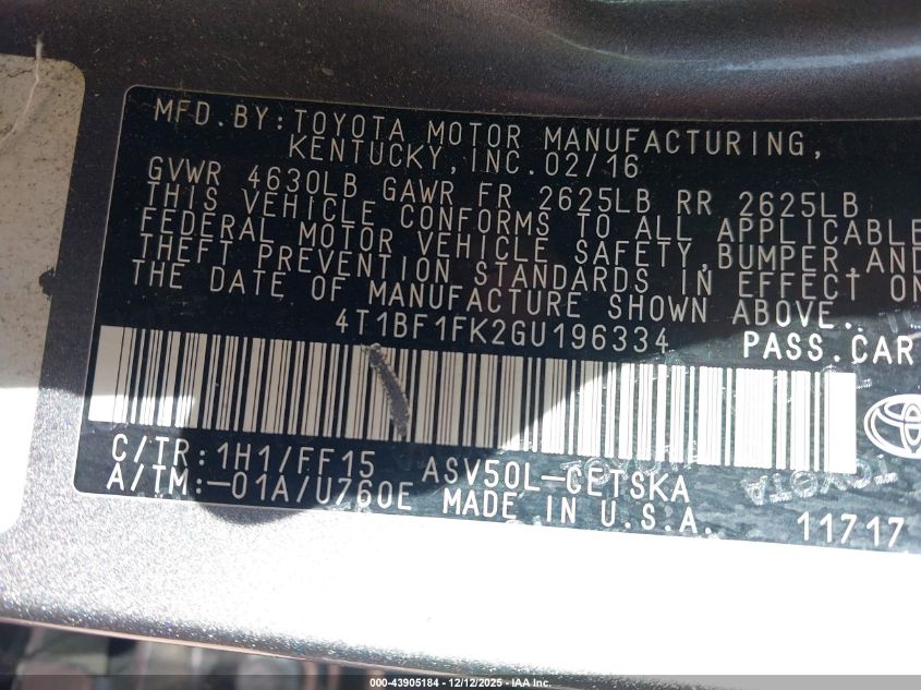 2016 TOYOTA CAMRY 2016 року Бензин, 2.5, Передній привід, vin - 4T1BF1FK2GU196334 з США