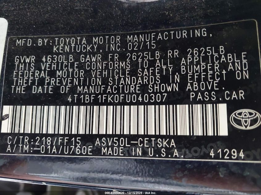 2015 TOYOTA CAMRY 2015 року Бензин, 2.5, Передній привід, vin - 4T1BF1FK0FU040307 з США
