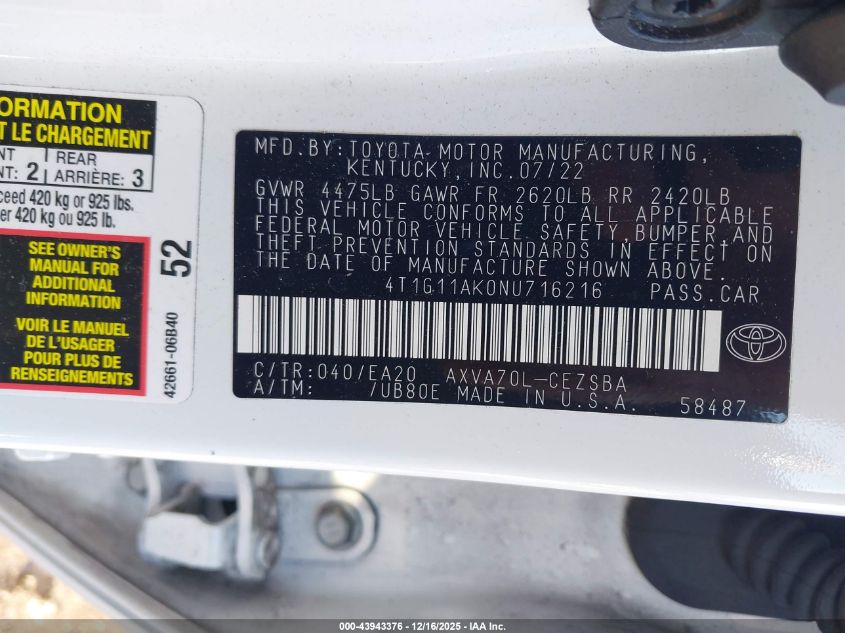 2022 TOYOTA CAMRY 2022 року Бензин, 2.5, Передній привід, vin - 4T1G11AK0NU716216 з США