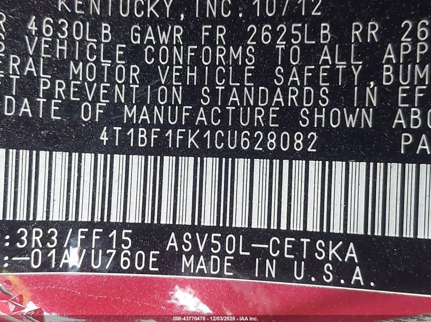 2012 TOYOTA CAMRY 2012 року Бензин, 2.5, Передній привід, vin - 4T1BF1FK1CU628082 з США