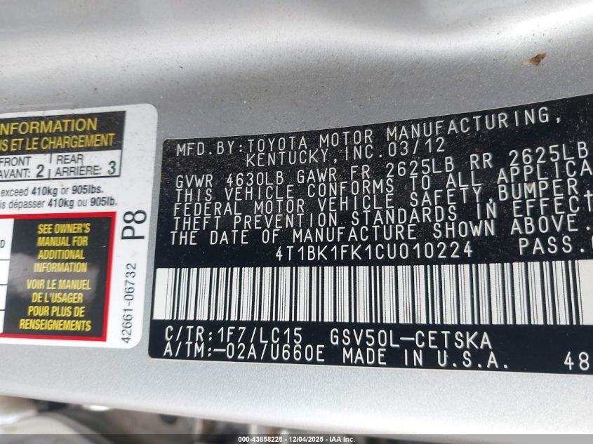 2012 TOYOTA CAMRY 2012 року Бензин, 3.5, Передній привід, vin - 4T1BK1FK1CU010224 з США