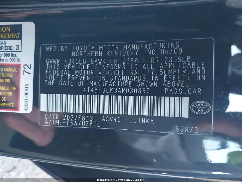 Колір СірийЦиліндри 4Привід Передній привідVIN 4T4BF3EK3AR030852Стан СтаціонарноУшкодження Звичайний зносДата аукціону 2025-12-23 AutoRIA