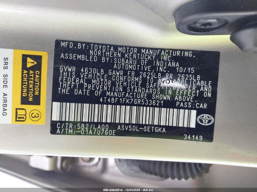 2016 TOYOTA CAMRY 2016 року Бензин, 2.5, Передній привід, vin - 4T4BF1FK7GR533621 з США
