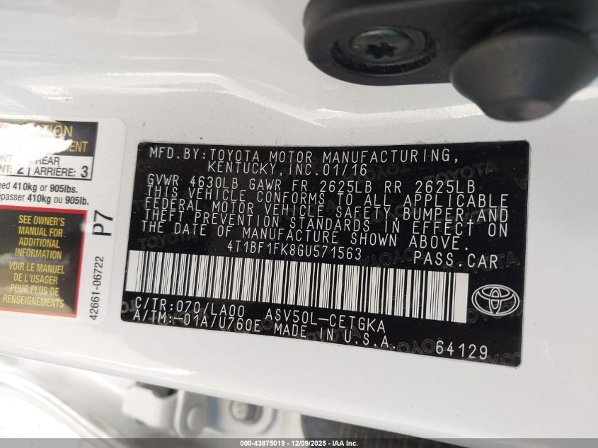 2016 TOYOTA CAMRY 2016 року Бензин, 2.5, Передній привід, vin - 4T1BF1FK8GU571563 з США