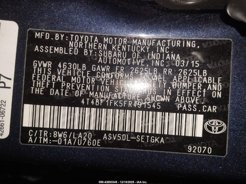 Колір СинійЦиліндри 4Привід Передній привідVIN 4T4BF1FK5FR491545Стан Заводиться та їде (перевірено)Ушкодження Передня або задня AutoRIA