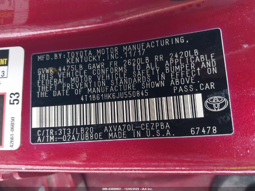2018 TOYOTA CAMRY 2018 року Бензин, 2.5, Передній привід, vin - 4T1B61HK6JU550845 з США