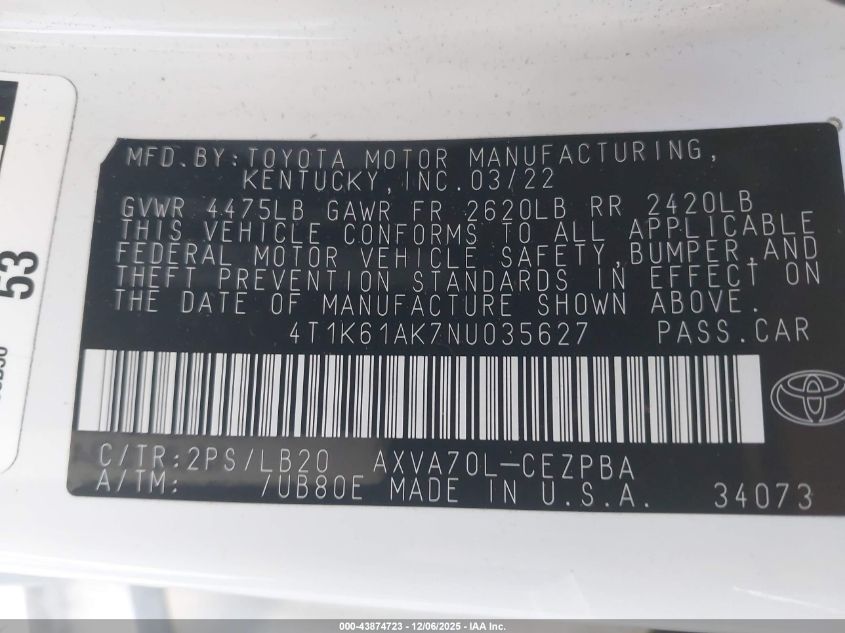 2022 TOYOTA CAMRY 2022 року Бензин, 2.5, Передній привід, vin - 4T1K61AK7NU035627 з США