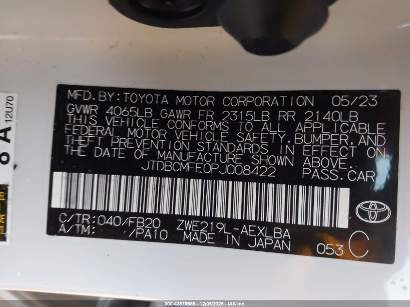 2023 TOYOTA COROLLA 2023 року Гібрид, 1.8, Передній привід, vin - JTDBCMFE0PJ008422 з США