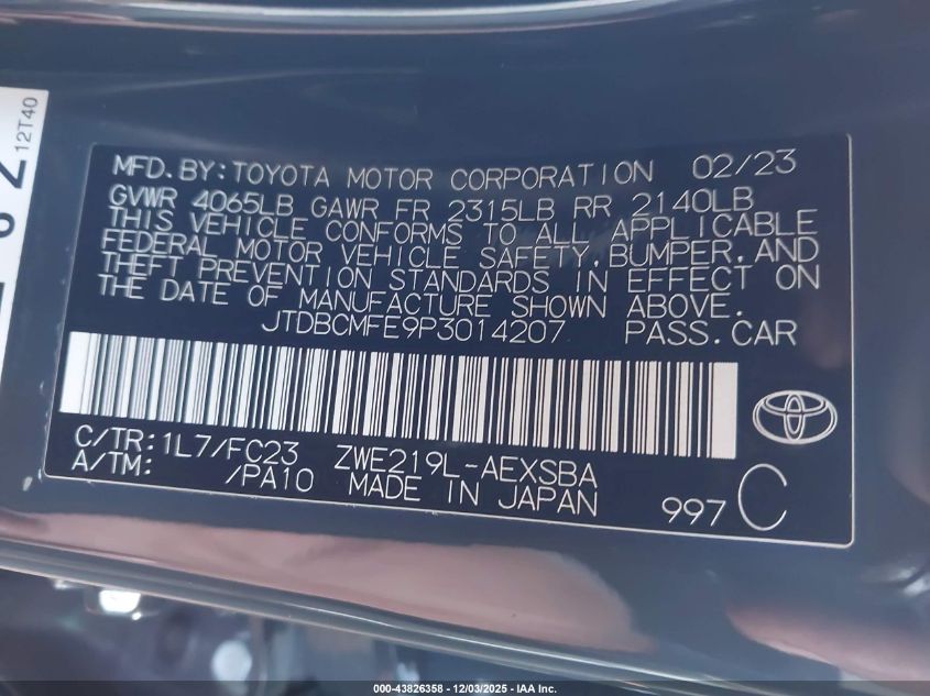 2023 TOYOTA COROLLA 2023 року Гібрид, 1.8, Передній привід, vin - JTDBCMFE9P3014207 з США
