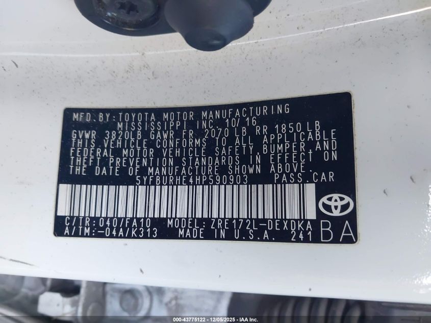 Колір БілийЦиліндри 4Привід Передній привідVIN 5YFBURHE4HP590903Стан Заводиться та їде (перевірено)Ушкодження Ліва сторона AutoRIA