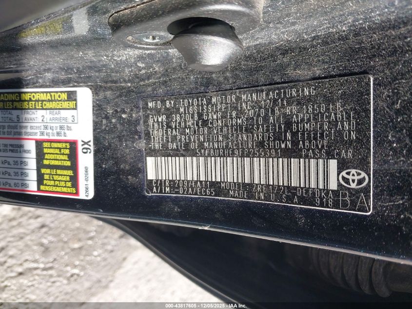 2015 TOYOTA COROLLA 2015 року Бензин, 1.8, Передній привід, vin - 5YFBURHE9FP255391 з США