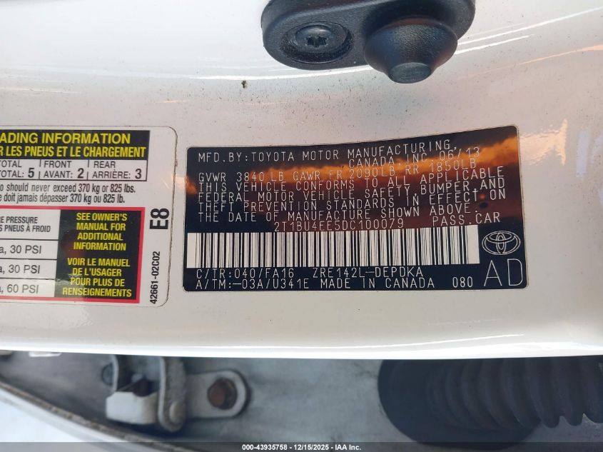 2013 TOYOTA COROLLA 2013 року Бензин, 1.8, Передній привід, vin - 2T1BU4EE5DC100079 з США