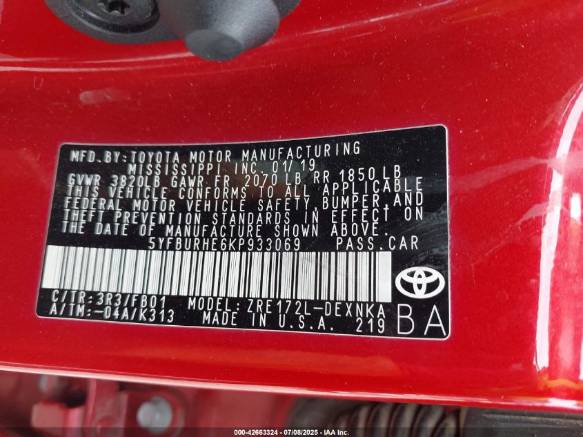 2019 TOYOTA COROLLA 2019 року Бензин, 1.8, Передній привід, vin - 5YFBURHE6KP933069 з США