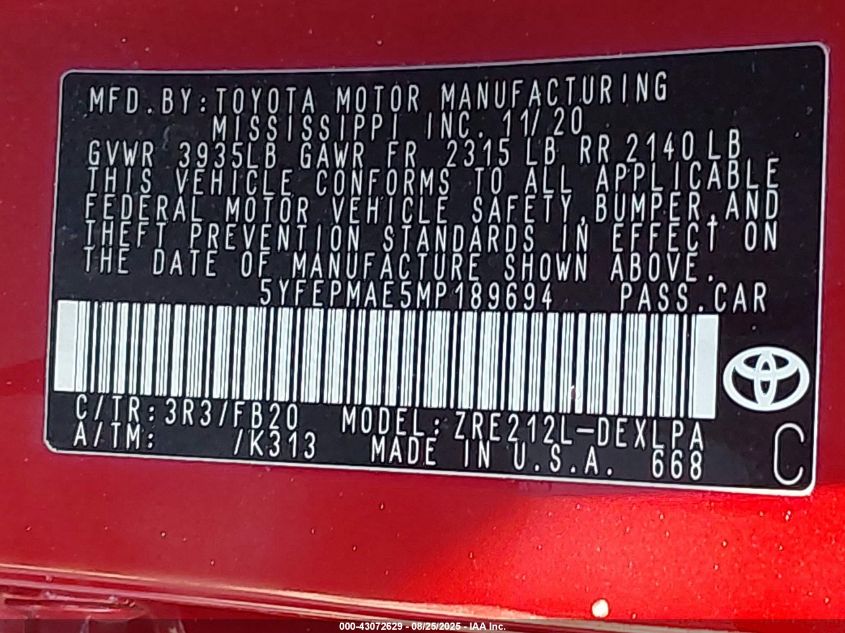2021 TOYOTA COROLLA 2021 року Бензин, 1.8, Передній привід, vin - 5YFEPMAE5MP189694 з США