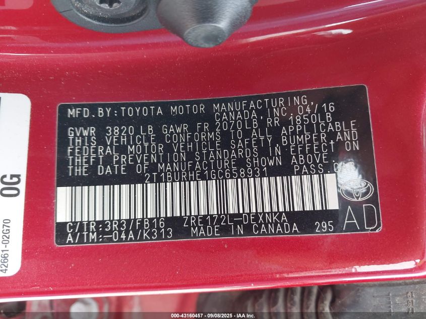2016 TOYOTA COROLLA 2016 року Бензин, 1.8, Передній привід, vin - 2T1BURHE1GC658931 з США
