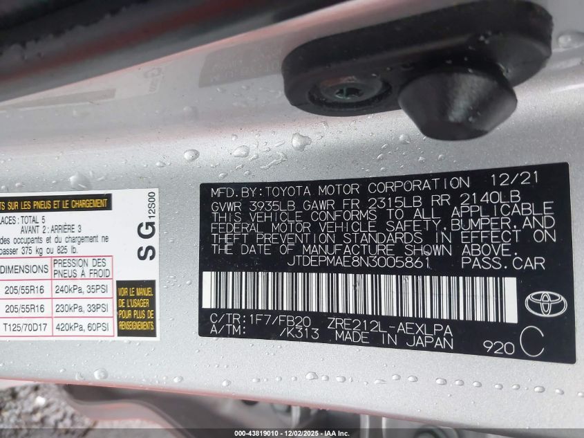 Колір СрібнийЦиліндри 4Привід Передній привідVIN JTDEPMAE8N3005861Стан СтаціонарноУшкодження Задня ліваДата аукціону 2025-12-10 AutoRIA